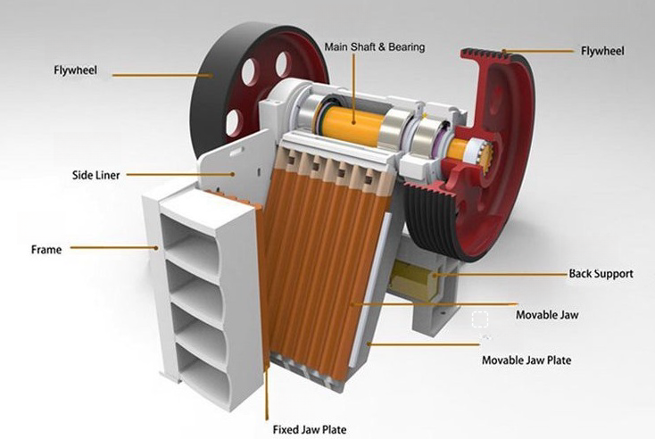 Jaw crusher is mainly composed of frame, eccentric shaft, large pulley, flywheel, side protection plate, elbow plate, elbow plate backseat, adjusting screw, reset spring, fixed jaw plate and movable jaw plate and other components.